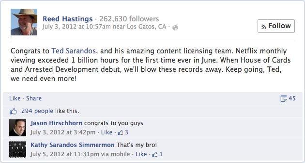 So this new freedom for CEOs and companies comes with one large stipulation: Investors must be informed of the company’s social media strategy before messages like Reed Hastings infamous post (see below) are fair game.