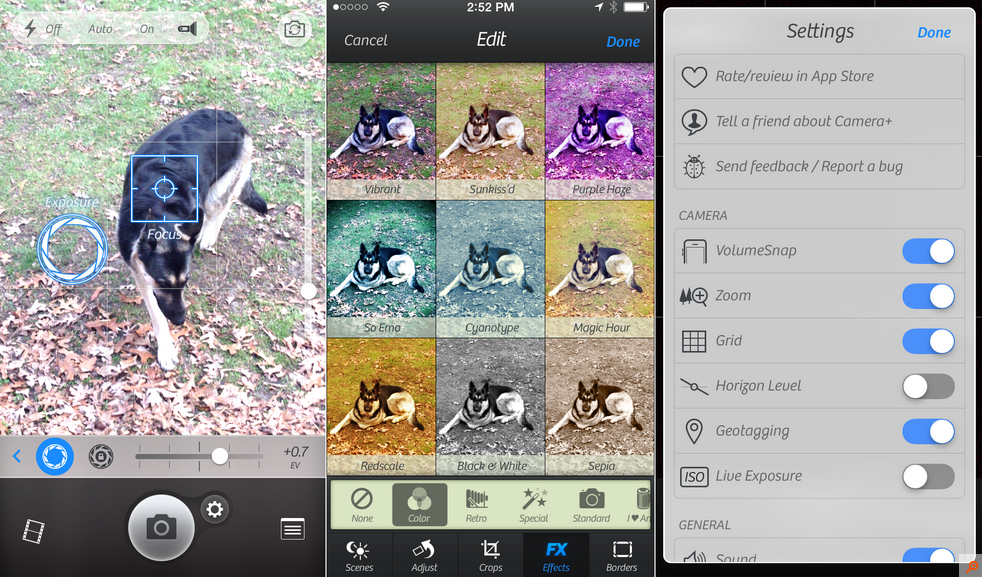 One of these apps is Camera+, which includes things such as separate focus and exposure points, adjustable exposure, tons of scene modes, a horizon level, and the usual suite of crops, borders, and insta-filters. On top of this giant suite of features, all pictures taken with this app can be stored in a file on your camera roll.